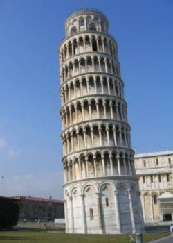 Et ce, dès sa construction au 12e siècle – sans doute à cause de la nature du site, une plaine alluviale dont la structure sédimentaire était inégalement dense et ne pouvait supporter convenablement un bâtiment aux lourds parements de marbre. L’inclinaison s’accentua avec le temps – atteignant plus de 5 degrés à la fin du 20e siècle. Plusieurs solutions furent alors testées : lestage des côtés, cryogénisation du sol pour l’affermir – expérimentation désastreuse sui conduisit à une accentuation de l’inclinaison. Enfin, l’extraction d’une grande quantité d’argile sur le pourtour des fondations permit le retour à une inclinaison acceptable.
