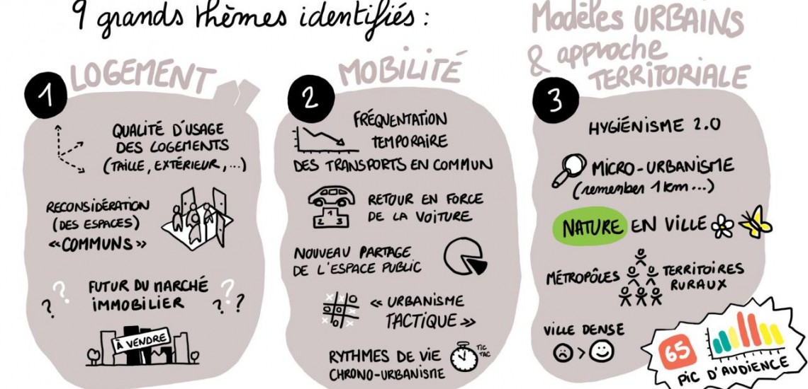 Dès la mi-mars, l’AGUR a identifié l’intérêt de capitaliser un maximum d’articles et de publications liant le contexte de pandémie et l’urbanisme au sens large, et ce afin d'anticiper la nécessaire analyse à mener a posteriori. Plus de 130 références ont été collectées, issues de diverses sources, et qui ont permis d’identifier 9 grands thèmes :