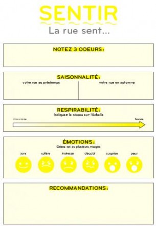 EV.- Le diagnostic sensoriel est un outil léger pour faire des études en mouvement : chaque page est consacré à un sens. Sur la page "Entendre", on trouve une évaluation des différentes ambiances sonores au fur et à mesure de la journée et des différentes émotions que ces ambiances procurent. Sur la page "Sentir" (photo ci-contre), on évalue l’émotion ressentie à l’odeur de la rue au printemps, en automne, la respirabilité… Sur la page "Toucher", on s’intéresse à la marchabilité. Sur la page "Voir", on questionne les émotions ressenties vis-à-vis de la hauteur des bâtiments, des couleurs, de la luminosité… Interroger à la fois les émotions et les perceptions donne accès à des informations qui ne ressortiraient pas forcément si on se contentait d’enquêter sur l’aspect fonctionnel de la relation à l’environnement. Nous ne laissons absolument pas de côté les méthodes utilisées jusqu’à présent en urbanisme, nous y ajoutons une analyse des relations humains-milieu et cet aspect psychologique, émotionnel, dont l’influence peut être très forte. Cela nous permet collectivement de proposer une vision enrichie et des aménagements qui vont fonctionner le mieux possible.